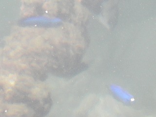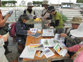 【左】北限のビロウドムラサキ          【中】伊藤先生が作られた資料        【右】島勝港でソラスズメダイとメジナ観察