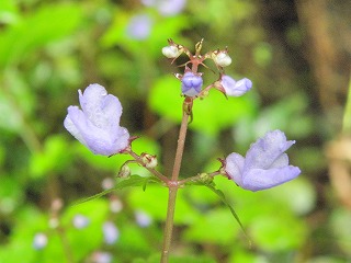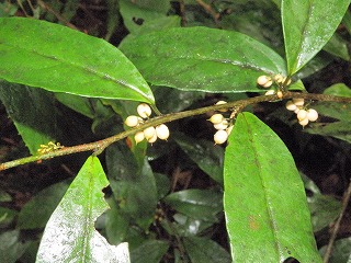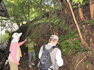 2日目は、馬越峠を植物を確認しながら楽しみました。ルートは道の駅海山〜天狗倉山山頂の往復、各々の体力で行ける所まで行きました。道中、ミカエリソウやリンドウの花、ルリミノキの実、紫色のさやのノササゲ、白いイズセンリョウの実など様々な植物が楽しませてくれました。次に尾鷲の向かい、県の天然記念物、法念寺の鉄魚を見に行きました。鉄魚は金魚(和金)とギンブナの交配によりできた品種で、尾びれの長いフナの様な魚でした。最後は、国指定天然記念物、九木神社樹叢をチェック。ここにはヘゴ科のシダ、クサマルハチがあるとのことでかなり探し回りました、が、発見できず残念でした。