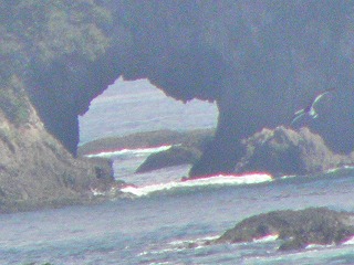 【左】望遠で撮影した島勝の海食洞門          【中】船越の海跡湖          【右】海跡湖の周りはハマナツメが群生している