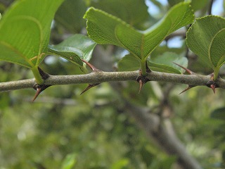 【左】ハマナツメの果実           【中】ハマナツメの枝に鋭いとげ           【右】海跡湖の生育していたオニビシ