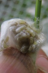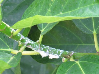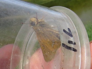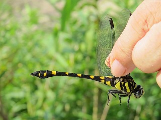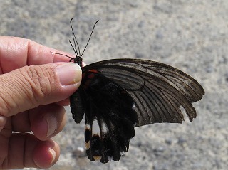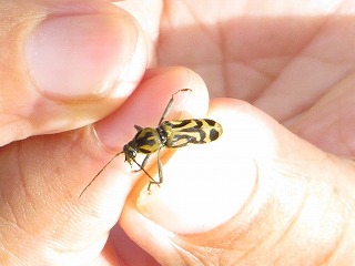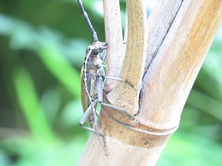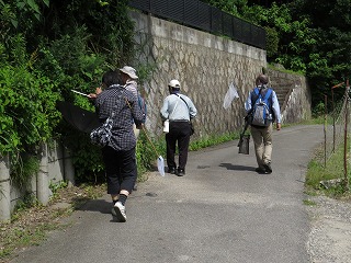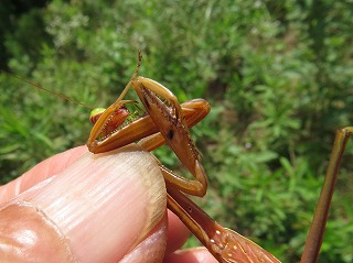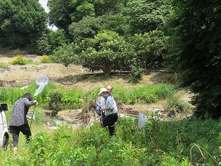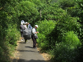 誰も来ないと思っていたら4人も来てくれ感謝、感謝です。晴れてうだるような暑さの中4月と同じコースを調査しました。駐車場の草むらは適度に草が生え虫が多くキリがないので虫探しを途中で切り上げ急坂をのぼり虫を探しました。暑さに耐えられず何度も休憩を取りました。高台周辺もたくさん虫が見つかりました。しかし4月多くのナナフシが見つかった茂みは一匹もナナフシを見つけられませんでした。不思議です。名和新池周辺以降は暑さで歩くのがやっとの状態で虫探しは浅井さん、門脇さん父娘に任せっぱなしでした。門脇さんの娘さんは頑張ってたくさん虫を見つけてくれ、浅井さんは叩き網という手法を駆使していろいろ虫を見つけてくれました。追跡対象種についてはナナフシモドキは見られず、ムネアカチビナカボソタマムシは昨年と同じアカメガシワで見ることができました。大曾根氏の希少種は今回も見られませんでした。タイワンウチワヤンマは珍しいと思いますが温暖化で急激に分布を広げているので追跡対象にはしませんでした。16:00に駐車場に戻り調査会を終了しました。(記・平松俊)
