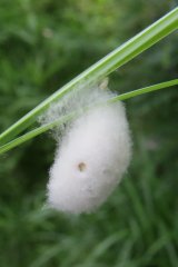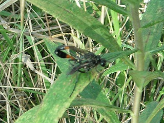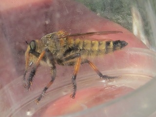 【左】クサカゲロウ類幼虫(桜にゴミでカモフラージュし、アリジゴクに似た頭が見える) 【中】ジガバチ類交尾(大きさでミカドジガバチ、サトジガバチと区別した。オス、メス?) 【右】シオヤアブ
