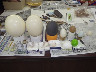 【左】持ち寄り品の説明  【中】卵の大きさ比べ。ダチョウ、エミュー、ウズラ、ウミガメなど