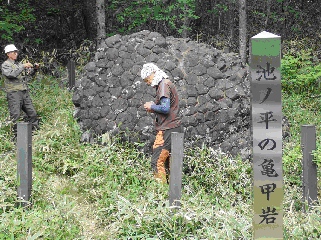 ◆池の平の亀甲岩 玄武岩の溶岩で、およそ1500万年から950万年前の新生代第三紀中期から後期に噴出したもので、くっきりとした柱状節理がみられ、地上の高さ2.4m、幅2.5mと重量感があり、柱状体の頭部は5角または6角形で、直径は15〜20cm。