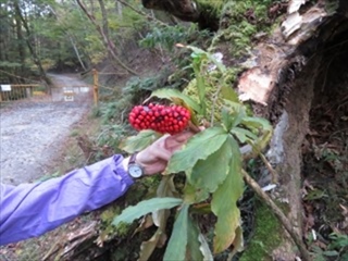 ・植物:カタヒバ、シャガ、イワタバコ(葉が大きい)、岩上のケヤキ(ケヤキの木が大きな岩の上から生えている)、お茶の木の花、フユイチゴ(つぼみと実)、アリドオシ、アザミ(花)の仲間など
