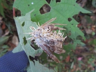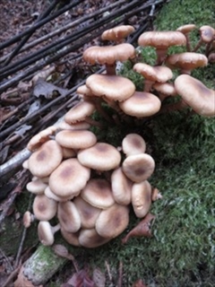 ・キノコ:アラゲキクラタケ、ヒラタケ、ヤブソテツ、ガにとりついた冬虫夏草(ガヤドリナガミノツブタケ?)