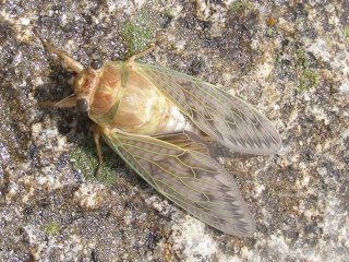 【左】水辺にアブラゼミの成虫の若がきていました。