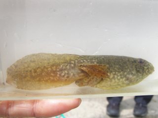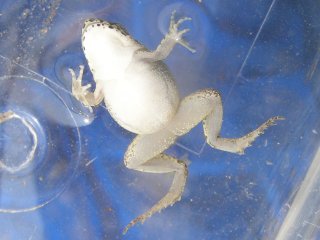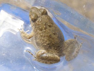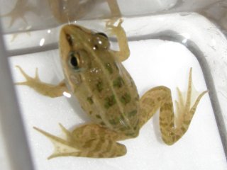 ダルマガエル、ウシガエルの2年生のオタマジャクシ、ヌマガエル、サカマキガイ、シジミの一種、セスジビル、イシビル、エラミミズ、カルガモ(鳥)、アオミドロ(植物)