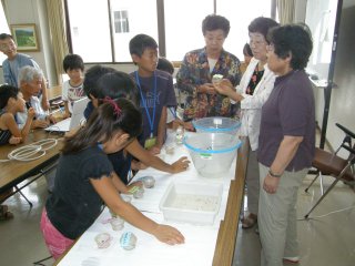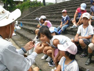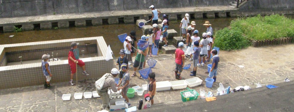 毎年恒例の観察会で、以前は、阿久比高校の近くで行っていました。猛暑の中での移動は、指導者も参加する子供たちも過酷であるので阿久比町保健センターの前に10年ほど前から変更しました。川の自然環境が違いますので、観察できる生き物は、随分違いがありますが、やや汚れて環境に生息するさまざまな生き物を観察することが出来ます。参加する子供たちにとっては、自然と触れ合う機会が少ないので、阿久比町保健センターの前での観察は、新鮮なものとなります。