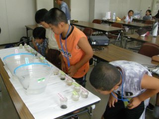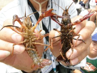 【左】アメリカザリガニとジャンケン。 【右】採集した小さな生き物を観察。
