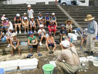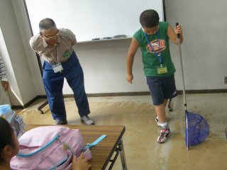 採集開始、手前は採集した生き物を種類別に入れるバット。