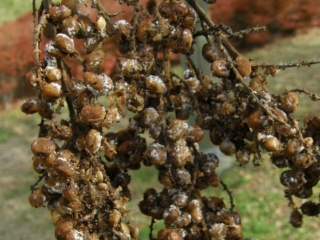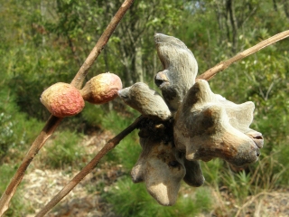 【右】ヌルデの実。なめると塩辛い味がします。昔の子供は喜んでなめたものです。