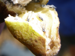 【左】中にはアブラムシがみられる。ヌルデオオミミフシアブラムシで秋にチョウチンゴケに移動し産子する。