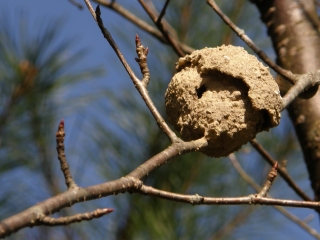 【右】狩人蜂の一種のスズバチの巣。