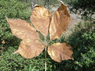 【右】ヌルデミミフシと呼ばれる虫こぶ。葉軸に、アブラムシの一種が寄生してできる。この袋には、タンニンが多量含まれており、染色・薬用に用いられる。江戸時代にお歯黒に使用された。