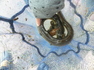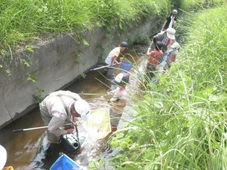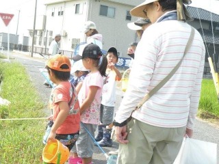6家族の参加であった。途中歩く距離がかなりあったがゆっくり観察しながら出かけた。馬池から水を引いている水田にはジャンボタニシやその卵が見つかった。車で行くとあっという間に付いてしまう距離も歩くといろいろなものが見つかる。クズの花も咲いていた。水路では、主のようなウナギが捕まったが、逃がしてやる。(記・中井康)