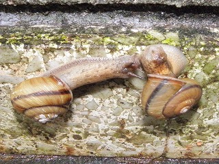 【左】地域文化センターの庭にキクメタケが生えていました。     【右】カタツムリの結婚式?