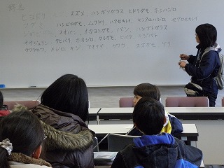 【左】見られた鳥のまとめをしました。 【中】見られた鳥を黒板に書き出しました。 【右】前日の雪が残っていました。