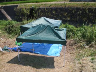 連日35℃を越す猛暑日の中、水に入れば子供達は大喜びである。すぐにウナギ名人の大野さんがウナギを捕まえたので、一段と張り切りがまして網を元気にすくっていたが、2匹目のウナギは捕まらなかった。しかし、全員が色々な生き物を捕らえることができてよかった。気温が高いので30分毎に水分補給に心がけ、ザリガニを手で初めて捕まえて大喜びの子、エビに触れて嬉しそうな子、蟹の巣を見つけて出てくるのをじっと見ている子等様々であったが、暑さを忘れ夢中になっていたのがなによりである。最後にテントの下へ集まり、中井さんの説明を聞いた。今年は、テントが2張りあり、涼しいので皆熱心に聞いていた。(記:吉房)