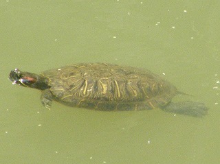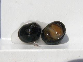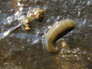 【左】イシマキガイ 【中】イシビルの仲間 【右】アカミミガメ(外来)