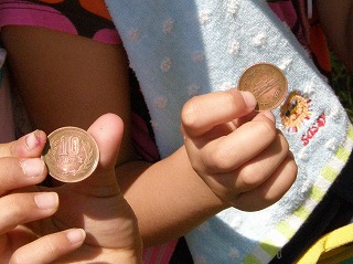 【左】お母さんたちも観察 【右】カタバミの葉で10円玉をみがく