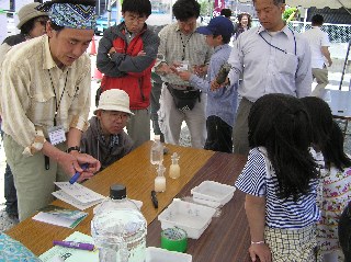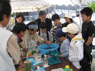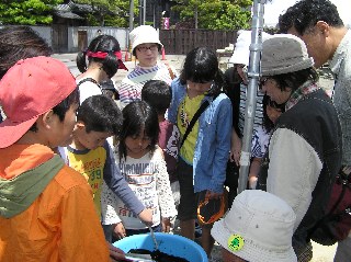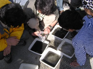 【中】運河の泥を採集し、どんな生き物が見られるか観察しています。