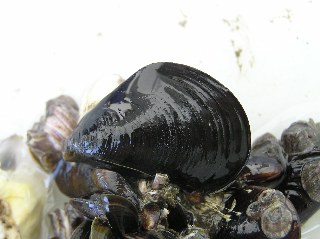 【左】外来生物のムラサキイガイ。フランス料理のムールガイはこれです。
