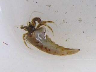 【左】カニさんの爪を住処に利用しているヤドカリさん。