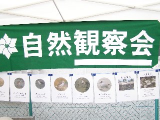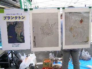 【右】半田港内のプランクトンの顕微鏡写真展示しました。下は自然物工作の見本。