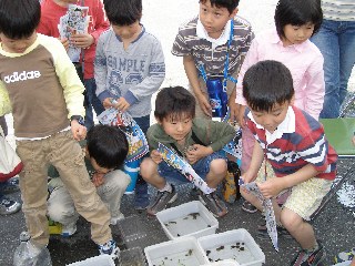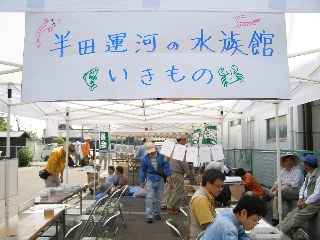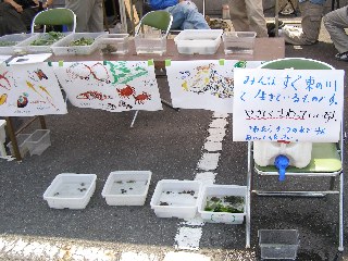【中】前日に採集した生き物で水族館を作りました。半田運河とあるのは十ヶ川です。