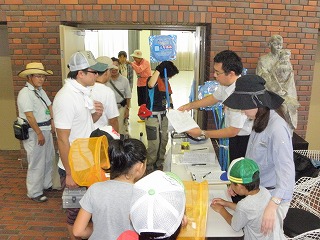文化センターのホール入り口で受付を行い、タモと飼育容器を子供達に、川の生き物についての資料(金内さんより、元は原氏からだそうです)を家族に1部配布した。受付で配布物に記名をお願いした。参加者はバケツと良いタモを準備している人も多かったが、虫捕り用の網を持ってきている人も一部にはいた。配布したタモは良いものではないが、大人にもタモが行き渡る点でもよかったと思う。それなりに役に立ったと思う。