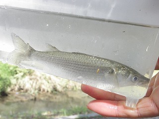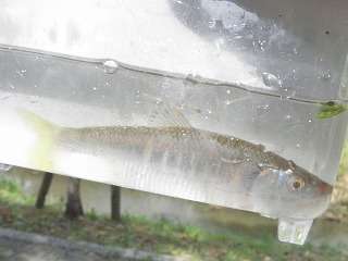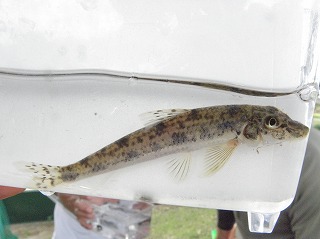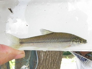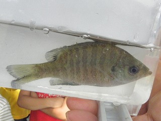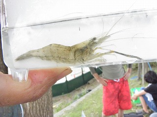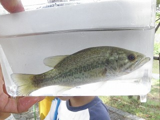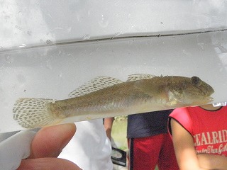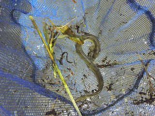 しっかりとタモの使い方を指導しているお父さんの姿が見られた。カダヤシや小さなエビはどの子も捕まえることができたので、それだけでも満足だった。もう少し大きな魚はいないだろうかと思い始めたころ、ウナギだとの声に色めき立った。タモの扱いがだんだん上手になって、いろいろな生き物が採集できるようになっていった。 分かち合いは、3つに分かれて行った。自分が採った魚やエビがうれしく、自分の魚のゆくえが気になったり、最後に自分で逃がしたいと思う子の気持ちにそえるように、他の班にまわしたりみんなに見せた場合は、本人の所に戻るようなの配慮が必要だ。いろいろな生き物の話や外来魚の話を聞き、外来魚は持ち帰りが許されないことも知った。