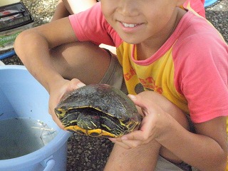 アカミミガメ、ヌマガエル