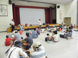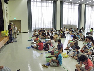 台風の影響もあって天気が心配されたが、川の生き物の観察ができてよかった。雨天時には工作(ゴム銃とモビール作り)が予定されていた。