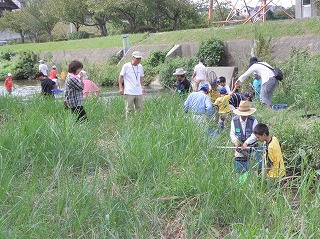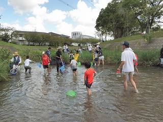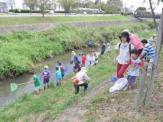 開会の会の後、6つの班に分かれて移動し、川に入って生き物を採取した。中央に深い部分があり、注意が必要であった。かなり深くまで入って行く子もいたが、保護者か笑顔で、しかも頼もしそうに見ていたので、見ているだけにとどめた。採集した場所の下流の部分よりも上流部分の方が採集しやすかったので、時間と共にみなが上流の方に移動していった。
