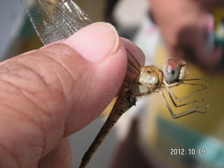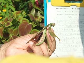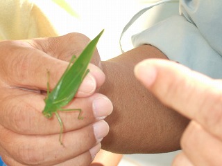 学校周囲を一回りする予定でしたが結局、校庭の花壇と校庭西の農園へ行っただけでした。花に虫が来るだろうと予想して、まず花壇へ生徒を連れて行きました。今回は虫を見つけても捕らずに姿、形、行動をじっくり観察しようとしました。しかしチョウもアブもじっとしているわけがなく、すぐにどこかへ飛び去ってしまい失敗に終わりました。生態観察をあきらめいつものように捕らえて説明する固定観察?に切り替えました。初めは私がシジミチョウやイボバッタを捕らえて見せて説明しましたがそのうちこつをつかんだのか生徒の方から次々に虫を捕まえて持ってきてくれました。大きなクダマキモドキが見つかった時は歓声が上がりました。予定時間の半分過ぎたところで花壇の観察を切り上げ農園の観察に向かいました。向かう途中で採集に飽きたのか生徒たちが木登りしたり遊び始めてしまい、引率の先生に引き戻してもらいました。農園ではトノサマバッタやカミキリムシが見つかったため生徒に再び採集意欲が出て予定時間まで観察を続けることができました。農園横の木陰でまとめをして観察会を終了しました。晴天が幸いし、校庭にいる虫の種類の多さに驚いたという感想が多く聞かれました。(平松俊)