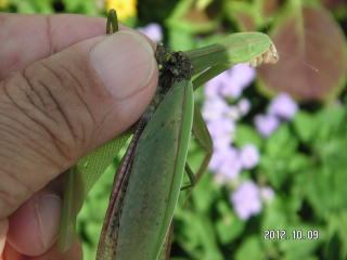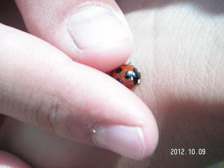 【左】ツマグロキンバエ(花壇の花上) 【中】オオカマキリ(花壇の草むら。捕まる際瀕死の重傷を負い、すぐ息絶えました) 【右】ナナホシテントウ(花壇の草むら)