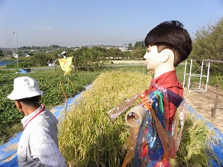 【左】この木は生活に大事な木です。 【中】オニバスは絶滅危惧種になっているよ。 【右】カカシと一緒に自然を守りましょう。