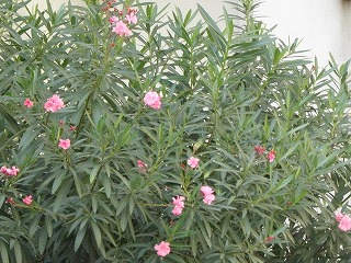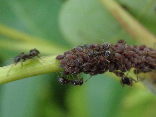 【左】キョウチクトウ(猛毒) 【中】アブラムシとアリ(アリがアブラムシから分泌した砂をもらう) 【右】サトクダマキモドキ(花壇付近で見つかりました)