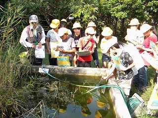 D希少植物・動物コース……学校の観察池にオニバスなど水の生き物を観察しました。