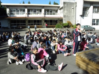 【左】おじさんとの対面式 【右】面の木の自然に親しみ、自然大切さを学びことを誓います。