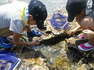 【左】潮だまりで魚やカニを探す 【右】浅瀬で魚を追う