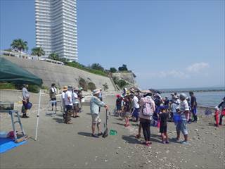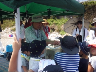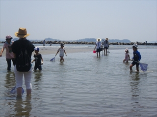 30分後ぐらいから本部前に洲ができはじめ、ここでも活動が始まったが、泳ぐ魚は見えても、さすがに誰も捕らえられない。陸となった部分で、タマシキゴカイの卵塊を気味悪そうに手のひらに載せている子もいた。(指導員がタマシキゴカイの本体を採ろうとしたが出来なかった…)