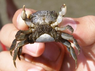 【左】ケフサイソガニの雌です。赤ちゃんをたくさん抱いています。
