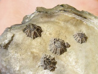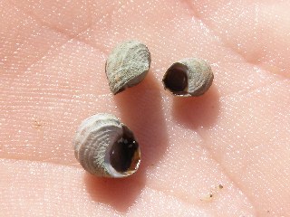 【右】マツバガイ。岩に張り付いています。巻いていませんが巻貝の仲間です。