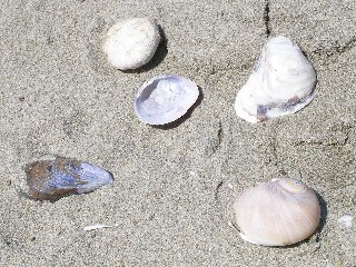 【中】ネイチャーゲームの「同じ物を見つけましょう」に使った貝殻。左からムラサキイガイ、オカメブンブク、シオフキ、カキ、ツメタガイ。