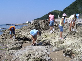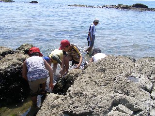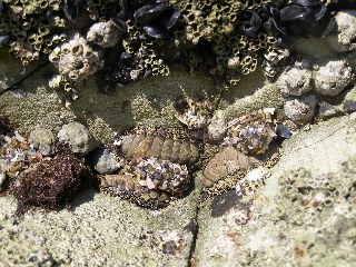 【左】磯の生き物。イボニシ、クロフジツボ、ヒザラガイ、ヨロイイソギンチャクなどが見られます。