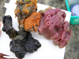 【左】ダイダイソカイメン、ムラサキカイメン、クロイソカイメン