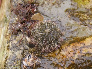 【左】石の下にカニさんがいました。 【右】岩にたくさんの生き物が付いていました。