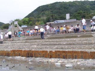 内海中学校区の小中学校の保護者の皆さんが子供たちに負けないよう教養を深める目的で毎年「教育講演会」を実施しています。今年度は「磯の生き物観察」を実施しました。天気は曇天で雲が少し低かったので雨の心配がありましたが磯に出て観察する時間は雨が降りませんでした。今年は9月に入っても35度近い猛暑になっていましたが曇天で快適な観察会が出来ました。  参加した保護者の皆さんは、子供に帰ったように楽しそうに海辺の生き物に触れ合っていました。最近、子供たちは海や山など自然の中に出ないといわれています。また、保護者の皆さんに聞くと「私の子は、海や山が嫌いだから私が行こうとしても付いて来ません」とよく言われます。小さな子が勝手に町に行き、遊ぶことはしません。保護者の皆さんが海や山に行って楽しむのだということを態度で示せば子供は喜んで付いてきます。この機会にぜひフィールドで自然に触れる機会を増やしてください。(記・降幡)